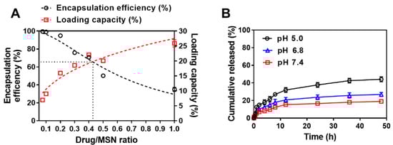 (A) Loading capacity and encapsulation efficiency according to DOX/MSN ratio; (B) the DOX release profile of MSN@DOX. Values are expressed as means ± SD (n = 3).
