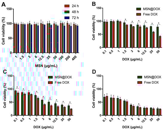 Cell viability of MCF-7 cells exposed to different concentration of MSNs, MSN@DOX, and free DOX. (A) MSNs; (B) after 24 h of MSN@DOX and free DOX; (C) 48 h of MSN@DOX and free DOX; (D) 72 h MSN@DOX and free DOX. Values are expressed as means ± SD (n = 5). * p < 0.05 compared with the free DOX group.
