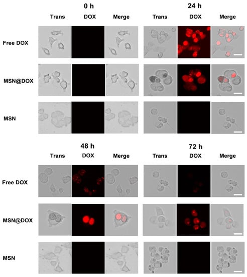 Representative fluorescence microscopy images of free DOX, MSN@DOX, and MSNs at 0, 24, 48, and 72 h in MCF-7 cells. Scale bar = 50 µm.