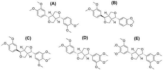 Chemical structures of (A) eudesmin, (B) fargesin, (C) epimagnolin A, (D) magnolin, and (E) yangambin.