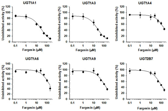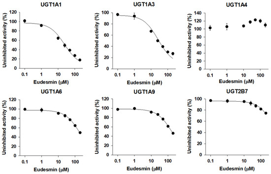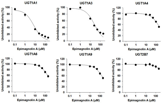 Eudesmin, fargesin, epimagnolin A, magnolin, and yangambin were selected as major tetrahydrofurofuranoid lignans that exist in the ethanol extract of flower bud of M. fargesii (NDC-052) and are also present in the rat plasma samples following oral administration [18]. Therefore, the inhibitory potentials (IC50 values) of eudesmin, fargesin, epimagnolin A, magnolin, and yangambin on UGT1A1, UGT1A3, UGT1A4, UGT1A6, UGT1A9, and UGT2B7 enzyme activities were evaluated in pooled human liver microsomes in the concentration ranges of 0.1–200 μM of individual tetrahydrofurofuranoid lignan (Figure 2, Figure 3, Figure 4, Figure 5 and Figure 6; Table 1). The concentration range of lignans tested in this study could cover the plasma concentration of lignans in rats after an oral administration of NDC-052 (22 mg/kg) and the expected gastric concentrations of five lignans. For example, the Cmax values of eudesmin, fargesin, epimagnolin A, magnolin, and yangambin were 2.2 ± 0.41 μM, 0.38 ± 0.18 μM, 3.07 ± 0.72 μM, 5.95 ± 1.12 μM, and 0.52 ± 0.30 μM, respectively, after single oral administration of NDC-052 (22 mg/kg) [18]. Herbal extracts are diluted by gastrointestinal fluid after oral administration by a factor of oral dilution volume (500–2200 mL in humans) [32,33]. Therefore, the expected gastric concentrations of eudesmin, fargesin, epimagnolin A, magnolin, and yangambin could be calculated as 29–127 μM, 25–110 μM, 78–342 μM, 140–618 μM, and 55–244 μM by considering the content of five lignans (eudesmin, fargesin, epimagnolin A, magnolin, and yangambin as 4.1, 3.4, 11.9, 21.5, and 9.1%, respectively) [18] and oral dose of NDC-052 in adult asthmatic patients (600 mg/day for 8 weeks) [19].