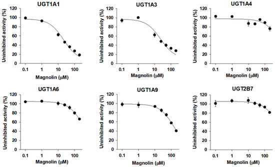 Inhibitory effects of magnolin (0.1–200 µM) on UGT1A1-, UGT1A3-, UGT1A4-, UGT1A6-, UGT1A9-, and UGT2B7-mediated glucuronidation of 0.5 μM SN-38, 2 µM chenodeoxycholic acid, 0.5 µM trifluoperazine, 1 µM N-acetylserotonin, 0.2 µM mycophenolic acid, and 1 µM naloxone, a probe substrate for UGT1A1, UGT1A3, UGT1A4, UGT1A6, UGT1A9, and UGT2B7, respectively, in human liver microsomes. The data are expressed as means ± standard deviations (n = 3).