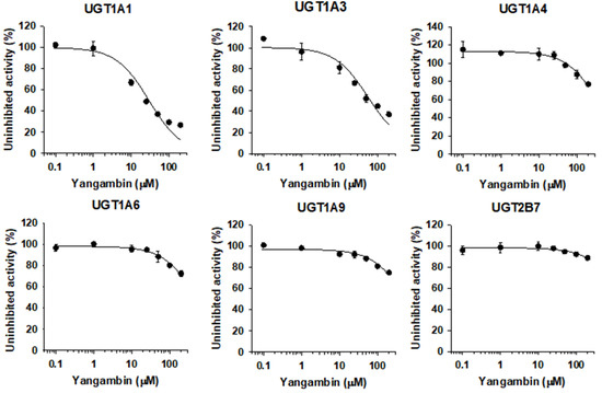 Inhibitory effects of yangambin (0.1–200 µM) on UGT1A1-, UGT1A3-, UGT1A4-, UGT1A6-, UGT1A9-, and UGT2B7-mediated glucuronidation of 0.5 μM SN-38, 2 µM chenodeoxycholic acid, 0.5 µM trifluoperazine, 1 µM N-acetylserotonin, 0.2 µM mycophenolic acid, and 1 µM naloxone, a probe substrate for UGT1A1, UGT1A3, UGT1A4, UGT1A6, UGT1A9, and UGT2B7, respectively, in human liver microsomes. The data are expressed as means ± standard deviations (n = 3).