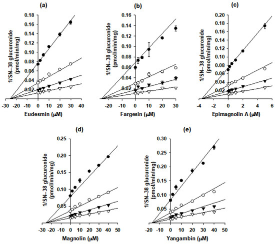 Dixon plots for the inhibitory effects of (a) eudesmin, (b) fargesin, (c) epimagnolin A, (d) magnolin, and (e) yangambin on UGT1A1-catalyzed SN-38 glucuronidation in pooled human liver microsomes. Each symbol represents the concentration of SN-38: ●, 0.2 μM; ○, 0.5 μM; ▼, 1 μM; ▽, 2 μM. The data are means ± SDs (n = 3).