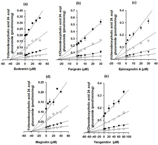 Dixon plots for the inhibitory effects of (a) eudesmin, (b) fargesin, (c) epimagnolin A, (d) magnolin, and (e) yangambin on UGT1A3-catalyzed chenodeoxycholic acid 24-acyl glucuronidation in pooled human liver microsomes. Each symbol represents the concentration of chenodeoxycholic acid: ●, 1 μM; ○, 2 μM; ▼, 5 μM; ▽, 10 μM. The data are means ± SDs (n = 3).