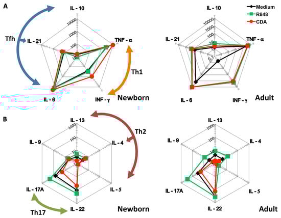 Adjuvant elicited T helper cytokine profiles on human newborn and adult blood. Human cord blood was used as a neonatal blood surrogate in vitro. Cord blood and human adult blood controls were diluted 1:1 with RPMI 1640 and incubated for 6 h in the presence of the neonatal gold standard adjuvant R848 (3.5 µg/mL/10 µM), CDA (5 µg/mL/7.6 µM), and medium control. Spider plots display cytokine values in pg/mL in supernatants of treatments for (A) IL-10, IL-21, and IL-6 (T follicular helper profile, Tfh), TNF-α and IFN-γ (Th1); and (B) IL-17 and IL-22 (T helper 17, Th17), IL-4, IL-5, and IL-13 (T helper 2, Th2) in cord blood (newborn) or adult blood. Results correspond to one out of two independent experiments.