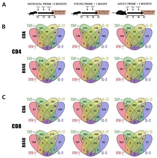 Mice antigen-specific cytokine responses to neonatal vaccination with different adjuvants. (A) Different vaccination strategies with ovalbumin (OVA) antigen and adjuvants (R848 and CDA). Neonatal mice received a prime (6–9 days old) followed by two boost doses (left diagram, neonatal prime + 2 boosts). Alternatively, the neonatal prime was skipped (center diagram, young prime + boost) or mice received the three doses as adult (right diagram, adult prime + 2 boosts). (B) Venn diagrams depicting the number of CD4+ T lymphocytes cytokine producers by million of cells measured by flow cytometry, after in vitro restimulation of splenocytes and surface and intracellular cytokine staining. Numbers in white are quadruple and triple cytokine producers regarded as indicators of maximal vaccine efficacy (i.e., producers of IL-2, IFN-γ, and TNF-α). Treatments depicted in A) correspond to the diagrams in the column below, where it is R848 or CDA adjuvantation. (C) Venn diagrams depicting the number of CD8+ T lymphocytes positive for individual or multiple intracellular cytokine staining. White numbers are quadruple or triple cytokine producers by million of cells analyzed. Results are average of 3–5 mice per group.