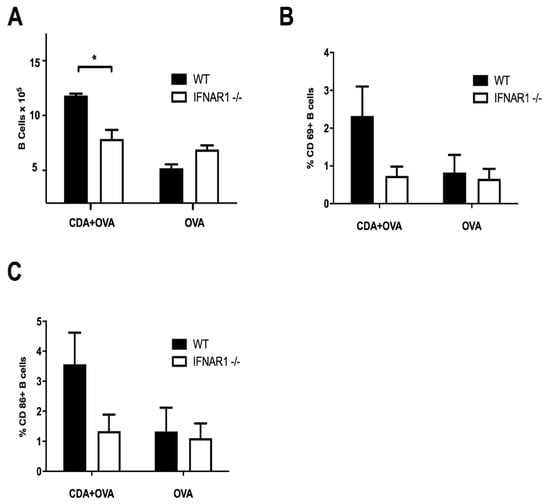 A key feature to determine vaccine efficacy is also the activation of B cells. Importantly, neonatal B cells are regulated by type I interferon (IFN-α/β) on their capacity to moderate inflammation upon infection via IL-10 [41]. It has also been reported that IFN-α/β is necessary for the activation and development of B cells in neonates [42]. In order to assess whether CDA-mediated generation of IFN-α/β was necessary for B cells maturation after vaccination, we vaccinated WT and IFNAR1−/− neonatal mice with CDA + OVA, OVA alone, or vehicle control. Neonatal mice were vaccinated by i.n. route at days 7–9 after birth, and euthanized 14 days after vaccination to measure the development and activation of B lymphocytes after in vitro restimulation with OVA (Section 2.5, Materials and Methods). We observed that the number of viable B cells after antigen-specific restimulation of splenocytes was significantly higher in WT mice vaccinated with CDA + OVA than in all other treatment groups (Figure 3A). Importantly, the expression of the activation marker CD69 and the surface maturation marker CD86 on the B cell subset was enhanced in WT mice vaccinated with CDA + OVA as compared with the other groups (Figure 3B,C). Although not statistically significant in neonates, the differences were maintained and acquired significance in adults after a prime and boost vaccination approach (Figure S4). This suggests that neonatal vaccination with CDA triggers IFN-α/β dependent mechanisms that are necessary for the activation and development of B cells.