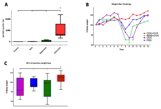 In order to assess the biological significance of our findings, neonatal mice were vaccinated using CDA as an adjuvant, and controls received R848 as a control neonatal adjuvant [43]. Mice were vaccinated according to the scheme displayed in Figure 2A, which consisted of a prime immunization given at day 7 of life (day 0 of the vaccination schedule), followed by two boosts on days 14 and 28 of the vaccination schedule. After vaccination, mice were challenged with a recombinant OVA-peptide expressing H1N1 influenza virus [31], and mice were monitored for 14 days after infection. In order to determine if the humoral response is stronger upon neonatal vaccination with CDA, OVA-specific IgG titers were measured in mice sera before the H1N1 challenge. Neonatal vaccination with CDA + OVA elicited the highest titers of antigen-specific IgG, being significantly higher not only in comparison to the OVA alone and PBS controls and in respect to the titers observed in mice vaccinated using R848 as an adjuvant (Figure 4A). Noteworthy, one mouse per group died in the control group and in the R848 group after challenge, whereas no deaths were observed in the OVA only or in the CDA + OVA group. Mice vaccinated with CDA + OVA maintained and gained weight over the 14 days after challenge (Figure 4B). In contrast, mice vaccinated with the TLR7-8 agonist R848, OVA alone, or PBS lost weight during the treatment, particularly between day 7 and 9 post-challenge (Figure 4B,C). The protection conferred by CDA was also significantly higher than the one conferred by the CDA-based vaccination where the neonatal dose was skipped (data not shown). The differences in protection between CDA and the other adjuvants and controls were significant during the 48 h of maximal weight loss (Figure 4C).