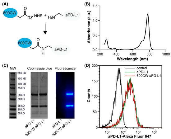 Analysis of 800CW-aPD-L1 conjugates. (A) Schematic illustration of 800CW conjugated to aPD-L1 through NHS ester reaction. (B) Absorbance spectrum of 800CW-aPD-L1 measured by the UV spectrophotometer. (C) SDS-PAGE of reduced aPD-L1 and 800CW-aPD-L1 by both Coomassie blue staining and fluorescence imaging. (D) Flow cytometry analysis of binding affinity of aPD-L1 and 800CW-aPD-L1 to GL261 cells with high surface PD-L1 expression (black: unstained control, red: 800CW-aPD-L1, green: aPD-L1).