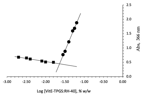 In fact, above the CMC values, the surfactants in water cause the spontaneous formation of nanomicelles. This process occurs mostly because it is thermodynamically favorable to produce a lower interfacial free energy system. The critical micellar concentration (CMC) was determined for the VitE-TPGS:RH-40 (1:1) molar ratio mixture using iodine as probe, and the obtained value was compared to that obtained by analyzing the single surfactants. Figure 1 reports the plot of absorption intensity of I2 (absorbance at 366 nm) as a function of the total surfactant concentration (log scale) calculated as the sum of the number of single components (VitE-TPGS plus RH-40). The CMC values were 0.026 and 0.029% w/w for VitE-TPGS and RH-40, respectively, confirming the value reported by Puig-Rigall et al. for VitE-TPGS [45] (CMC ≅ 0.02%). A lower CMC value with respect to the single surfactants, 0.023% w/w, was obtained for VitE-TPGS:RH-40 (1:1) molar ratio. The critical micelle concentration is an essential parameter influencing both in vitro stability and in vivo activity of nanomicelles. In this context, a low CMC value seems essential and, in our case, the CMC reduction to 0.023% w/w value for the VitE-TPGS:RH-40 1:1 mixture makes this formulation an ideal binary combination, showing a CMC intermediate value between those of the individual polymeric surfactants [46].