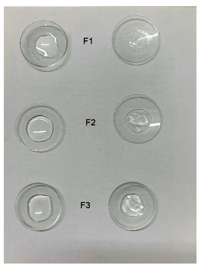 Three Fx/N2CyA-ASNg formulations based on different concentrations of gelling polymer and containing CyA loaded nanomicelles were developed with the aim to prolong the residence time in the precorneal area after ocular application. A picture of these formulations is shown in Figure 2.