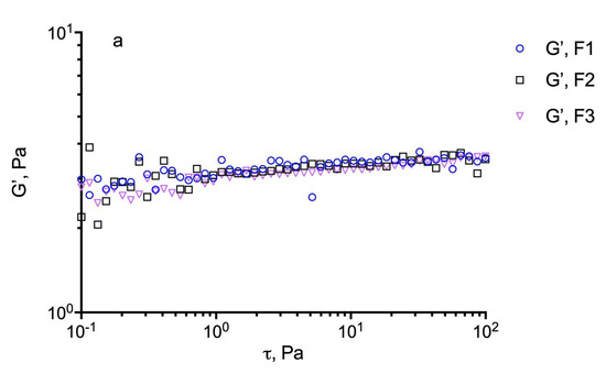 - Stress sweep analysis, in which the stress (τ) was varied between 0.1 and 100 Pa, while the frequency was kept at 5Hz to determine the linear viscoelastic region (LVR) and consequently the maximum deformation reachable by the sample;