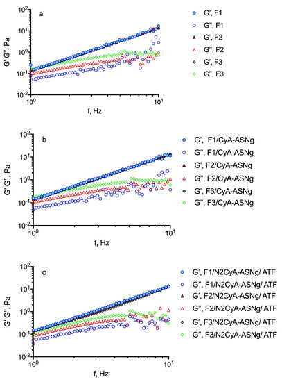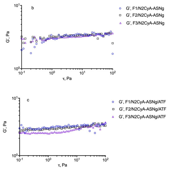 The viscoelastic characterization of the formulations (Fx, Fx/N2CyA-ASNg and Fx/N2CyA-ASNg/ATF) was carried out by means of a controlled-stress rheometer (Haake Rheostress RS 1, Thermo Fisher Scientific, Karlsruhe, Germany) equipped with coaxial cylinder sensor system (Z40 and Z41) using the Haake RheoWin™ Software (Version 4.61, Thermo Fisher Scientific, Karlsruhe, Germany) for data acquisition. Prior to analysis, the system was equilibrated with a five-minute waiting time to reach the selected temperature (32 ± 0.2 °C). Steady shear measurements were performed at shear rates ranging from 0 to 120 s−1. The analyses were performed in triplicate [38].