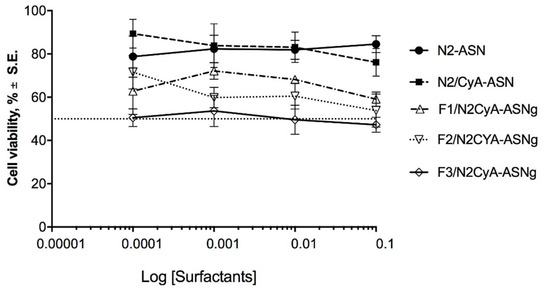 The results of the cytotoxicity test are shown in Figure 7, where the percentage of viable cells is reported as a function of the concentration of surfactants, an essential part of the prepared nanomicelles and a critical component in terms of cytotoxicity. This choice was also made considering that, in a previous study, the same authors [27] evaluated the cytotoxicity of a CyA solution obtained by diluting a DMSO stock CyA solution, which seemed to maintain cell viability of around 75%, except for the highest concentration, which determined a reduction in viability to 58%. On the basis of this information, in the current work, we focused our attention on the influence of the surfactants towards cell viability. The treatment of the cell line with the different preparations did not reveal a remarkable toxic effect. Cell viability was above 50% for all tested concentrations, with the exception of F3/N2CyA-ASNg formulation, which fluctuated in the acceptable 50% cell viability limit for all the tested concentrations (Figure 7). Both blank nanomicelles (N2-ASN) and those containing drug (N2/CyA-ASN) maintained cell viability above 80% with no statistically significant difference between the two formulations. The addition of GG-LA (F1-F3/N2CyA-ASNg) produced a decrease in cell viability up to 50% for the highest polymer concentration. This behavior appeared to be closely related to the GG-LA concentration and consequently to the degree of gelling.