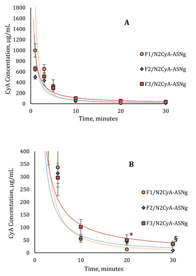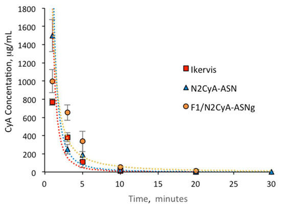 The CyA concentration in the tear fluid of rabbit eyes treated with the micellar formulation was significantly higher immediately after administration (C1min for N2CyA-ASN = 1497.72 ± 174.8 μg/mL) in comparison to Ikervis® and to the experimental products with higher GG-LA concentration (F2-F3/N2CyA-ASNg) (p < 0.05, two tails unpaired t-test). Nevertheless, the nanomicellar formulation produced a quick elimination of drug from tear fluid, as graphically shown in Figure 8 and Figure 9, with a concentration of CyA in tear fluid of 251.12 μg/mL just 3 min after instillation. The elimination rate constant for the N2CyA-ASN nanomicellar system was reduced more than two times if compared to that calculated for Ikervis® (Ke = 0.091 and 0.205 min−1 for N2CyA-ASN and Ikervis®, respectively), causing less rapid CyA elimination form the eye. In conclusion, the nanomicellar formulation increased the CyA bioavailability by approximately 2-fold if calculated between 1 and 30 min, but only by 1.2-fold with respect to commercial reference if the 3–30 min interval was considered to determine the AUC.