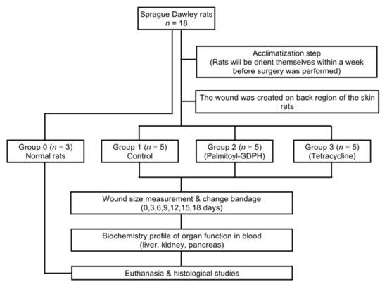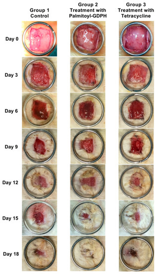 The wounds of Group 1 rats were treated topically with 1.0 mL of normal saline solution every three days; this served as the control group. The wounds of Group 2 rats were treated topically with 1.0 mL of Palmitoyl-GDPH (12.5 µg/mL) every three days. Meanwhile, the wounds of Group 3 rats were treated topically with 1.0 mL of tetracycline (12.5 µg/mL) every three days and served as a reference standard control. The concentration used was the minimum concentration from the in vitro study as reported previously [27].