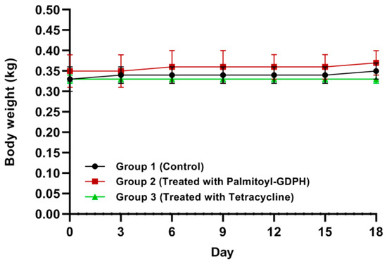 The observation of physical changes and animal behavior were also important in the in vivo studies. Table 3 shows that there were no abrupt body weight changes in all tested rats. In this study, body weight was monitored as one of the clinical signs. The changes in body weight were plotted against time as shown in Figure 2. Any sudden body weight changes indicated signs of stress or other abnormalities [39]. From the observation, the treated rats were physically active and consumed feed and water in a regular way. There was no adverse reaction to treatment until at the end of experiment. The weight of rats treated with Palmitoyl-GDPH (Group 2) and commercial drug tetracycline (Group 3) were not significantly difference from the control group (Group 1) and remained comparable throughout the experimental time.