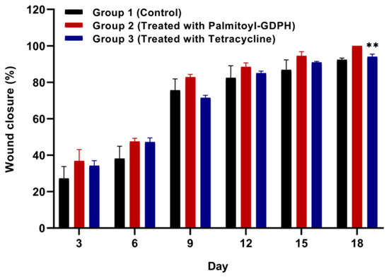 Moreover, the wound treated with Palmitoyl-GDPH had a better healing percentage compared to the tetracycline group (Group 3). By day 18, almost 100% of wounds treated by Palmitoyl-GDPH had fully recovered with smooth and flat appearance compared to 94.04 ± 1.44% in the tetracycline group (p < 0.01). The control group possessed the minimal wound reduction of 27.27 ± 6.50% on the third day of evaluation and the percentage of wound contraction escalated over the consecutive period of treatment to reach about 92.36 ± 0.91% after 18 days post-surgery. However, the wound bed for the control group was still moist at the central wound region despite the reduction in the wound area over time was observed. This is probably due to the saline that also can promote the healing process by speeding the wound contraction [37,40].