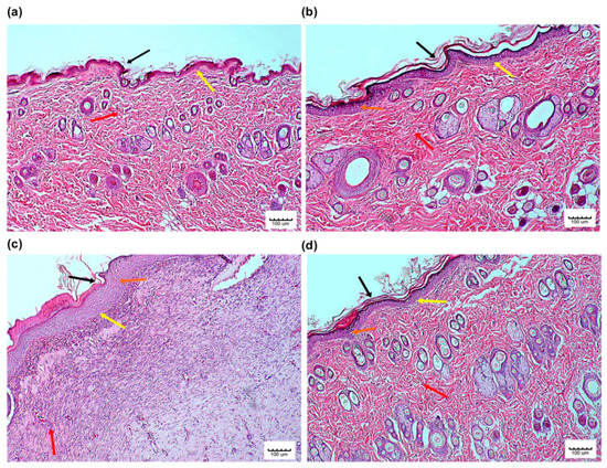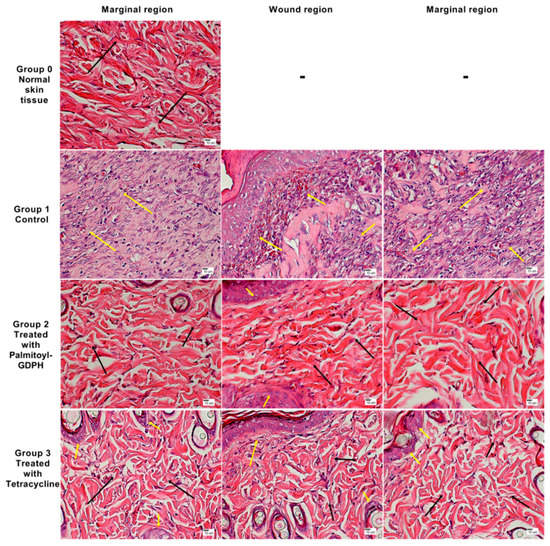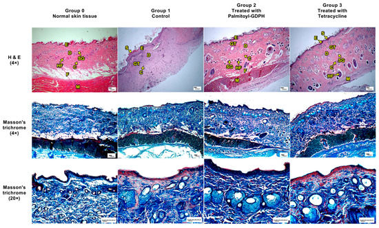 Moreover, in order to obtain a much more objectively defined results, a quantitative evaluation of selected parameters of wound healing was conducted as previously shown in Section 2.11. The histological image of the normal skin (Group 0) shown in Figure 7a represents a skin that is within normal limits. Our results revealed that the skin tissue especially the epidermal integrity and epidermal-dermal junction in the Palmitoyl-GDPH treated group (Group 2) in Figure 7b presented a better histological appearance compared to control (Group 1 in Figure 7c) and tetracycline (Group 3 in Figure 7d). This could be explained through the ability of the Palmitoyl-GDPH tetrapeptide in promoting wound healing process as well as accelerating the regeneration of epidermis, preserving the structural integrity of skin with replacement by fibroblast, and enhancing collagen deposition.