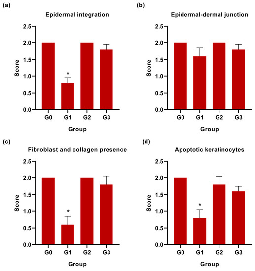 At the end of experimental period, no significant difference was seen in the epidermal-dermal junction histology. There was a well-developed epidermal-dermal junction in all groups with an almost clearly defined dermis with many of the intact morphological features. In addition, our results showed a higher apoptotic keratinocyte in the control group (Group 1) as compared to other groups. A previous study reported that inflammatory cells undergo apoptosis, and our findings indicate similar results where the Group 1 also showed a high percentage of inflammatory cells [52]. All the statistical analysis of the microscopically recorded scoring are shown in Figure 8.