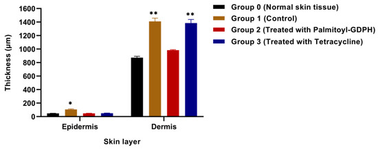 Epidermis and dermis thickness at the end of the experimental period. Data are shown as mean ± SD obtained from triplicate experiments. The asterisks (*) represent significant difference (* p < 0.05) and very significant difference (** p < 0.01) from normal skin tissue (Group 0).