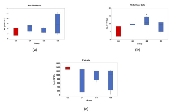 Hematology analysis for 3 major categories of blood cells; (a) red blood cells, (b) white blood cells and (c) platelets. The G0, G1, G2, and G3 represent Group 0 (normal rats), Group 1 (Control rats), Group 2 (Palmitoyl-GDPH treated rats), and Group 3 (tetracycline treated rats), respectively. * Denotes significance (versus normal group) at p < 0.05.