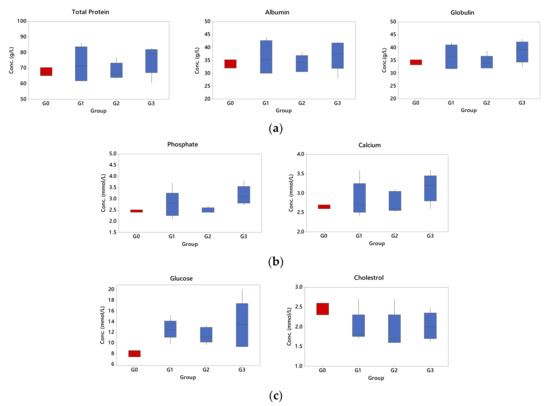 This was also observed for ion components like phosphate and calcium. The results of the treated groups (Groups 1, 2, and 3) were comparable, with no significant difference with the normal group (Group 0) (p > 0.05). In contrast, the results of representative metabolites like glucose and cholesterol showed a rather different pattern as depicted in Figure 12c. All the treated groups (Groups 1, 2, and 3) showed a small increase in glucose concentration, while the cholesterol level was lower in the blood compared to the normal group (Group 0). Naturally, the measurement of glucose was very different even for untreated rats and tightly regulated via homeostasis. Consequently, an abnormal level of glucose is the indicator for diabetes and also its concentration can increase due to stress [59,60]. For this case, it is likely elicited of out stress from the wounding and pain. However, our results show the difference in glucose concentration where is still within the reference range and being similar to the normal rats (Group 0).
