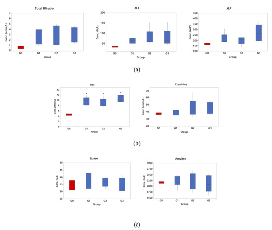 Chemistry analysis for indicators of organ function in blood; (a) Indicators for liver function (total bilirubin, ALT, ALP), (b) kidney (urea, creatinine) and (c) pancreas (amylase, lipase). The G0, G1, G2 and G3 represent Group 0 (normal rats), Group 1 (Control rats), Group 2 (Palmitoyl-GDPH treated rats), and Group 3 (tetracycline treated rats), respectively. The asterisks (*) represent significant difference (* p < 0.05) from normal group.