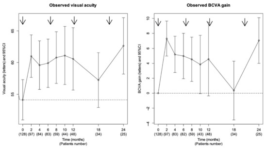 Functional efficacy. Mean best-corrected visual acuity (BCVA) and BCVA gain in Early Treatment Diabetic Retinopathy Study Letters (ETDRS) from baseline during the follow-up. When the vertical line cuts the dotted line, the value is not statistically different from the baseline value. Arrows represent the median dates of injection.