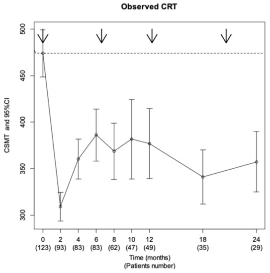 Anatomical efficacy. Evolution of mean central subfield macular thickness (CSMT) during the study period. Arrows represent the median dates of injection.