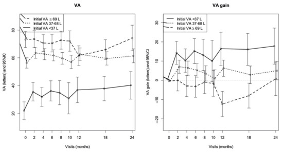 The probability of belonging to Group B was significantly higher in patients with low baseline VA <37 letters (p < 0.001) and between 37–68 letters (p = 0.017). There was no other factor that stood out as significantly associated. In particular, there was no significant difference between the two groups regarding the numbers of patients undergoing cataract surgery: eight phakic eyes (40%) of Group B were operated on, in comparison to 15 eyes (37.5%) of Group A (p = 0.99). Figure 3 illustrates changes in final VA and VA gain depending on baseline VA and shows that the lower baseline VA, the lower the final VA at 24 months. On the contrary, the lower the baseline VA, the greater the VA gain.