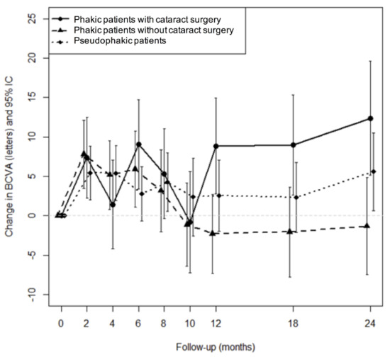 A total of 104 (79%) eyes had an IOP ≤21 mmHg at any visit during the follow-up study and only 10 eyes (7.4%) had an IOP ≥25 mmHg. A total of 39 patients (29%) needed topical antiglaucoma medication and all of them were controlled with topical monotherapy [16]. No glaucoma filtering surgery was performed in the present study. Cataract surgery was performed in 42.6% of the phakic eyes (n = 26/61) during the study period, and 65% of these surgeries occurred after the first IVI. There was no significant difference between the two groups regarding the numbers of patients undergoing cataract surgery—eight phakic eyes (40%) of Group B were operated on, in comparison to 15 eyes (37.5%) of Group A (p = 0.99). The improvement in BCVA after cataract surgery could be due to the reduction of macular edema (ME) following DEX-implant injection and cannot be differentiated from cataract extraction. Figure 4 shows the effects of cataracts on BCVA over time. The mean improvement in BCVA obtained using DEX-implant in the subgroup of phakic patients having undergone cataract surgery improved over time.
