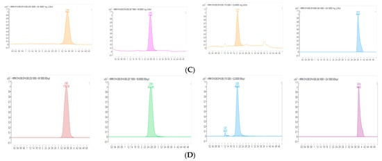 A novel analysis method was developed for simultaneous determination of lidocaine and two metabolites in rat plasma samples using an Agilent 1290 Infinity II UPLC system coupled with an Agilent 6490 tandem mass spectrometer (Agilent Technologies, Santa Clara, CA, USA). Standard stock solutions of lidocaine, MEGX, GX, and ISTD were individually prepared in 100% methanol at a concentration of 1 mg/mL and stored in a refrigerator (−20 °C). The ISTD solution was prepared in the same manner to a final concentration of 100 ng/mL. A total of 1 mL mixed working solutions of four compounds (lidocaine, MEGX, GX, and ISTD) were prepared by diluting the 100 µL of each compounds’ standard stock solution with 500 µL 50% aqueous methanol. Samples for calibration curves and QC (quality control) were prepared by spiking 5 µL of the standard working solution in 45 µL of blank rat plasma. The final concentrations of the standard calibration curves for all four components ranged between 1 to 500 ng/mL (1, 5, 10, 50, 100, 500 ng/mL). QC samples were prepared at 1 (lower limit of quantitation, LLOQ), 3 (low QC, QL), 80 (mid QC, QM), and 400 (high QC, QH) ng/mL for accuracy and precision evaluation.