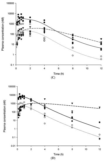 The model-predicted plasma concentration-time plots fitted to the observed data of each group are shown in Figure 4.