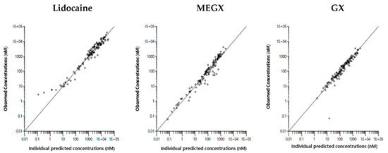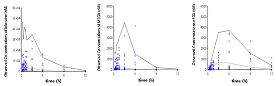 Visual predictive check plot of the final model. A total of 1000 datasets were simulated using the final PK parameter estimates. Circles represent the observed lidocaine, MEGX, and GX concentrations. The lines in each graph represent 5th, median, and 95th percentiles of the simulated concentrations.