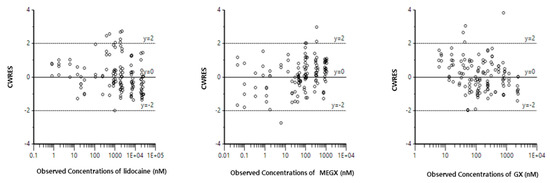 Representative MRM chromatograms of zero-blank plasma, LLOQ, and ULOQ are shown in Figure 2. There were no significant interferences from endogenous substances around retention times of analytes in blank plasma, indicating sufficient specificity of the method. Retention times of lidocaine, MEGX, GX, and the ISTD were 3.5, 2.6, 2.0, and 3.8 min, respectively.