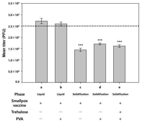 Virus titers of (a) smallpox vaccine (F1) (liquid), (b) smallpox vaccine + polyvinyl alcohol (F2) (PVA; liquid), (c) smallpox vaccine (F1) (reconstituted after solidification), (d) smallpox vaccine + PVA (F2) (reconstituted after solidification), and (e) smallpox vaccine + PVA + trehalose (F4) (reconstituted after solidification). Dotted line indicates the estimated virus titer. Statistical significance compared to liquid smallpox vaccine (a) was determined using Student’s t-test (*** p < 0.001).