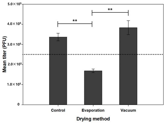 Effect of drying method on vaccine stability. Liquid formulation was used as a control. Statistical significance compared to the evaporation and vacuum drying samples was determined by a t-test (** p < 0.01).