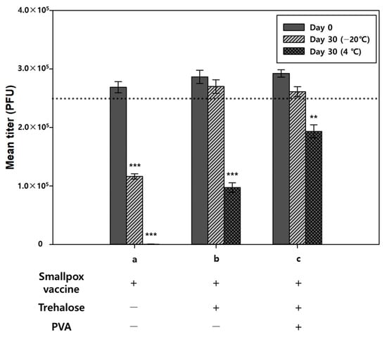 Compared to the viral titer right after solidification, storage at −20 °C for 30 days caused additional 56.7% reduction in titer (Figure 4, group a). This reduction may be due to freeze–thaw stress and ice crystal formation during reconstitution and storage [39,40,41]. When trehalose was included in the vaccine formulation, the viral titer was well maintained (Figure 4, group b and c), suggesting that trehalose acts as a good cryoprotectant for the vaccina virus. Notably, the addition of PVA to the formulation appeared not to be effective in retaining the virus titers under frozen storage conditions compared with the trehalose-only formulation. However, the PVA–trehalose formulation showed improved storage stability at 4 °C. We speculate that PVA might not be able to protect the virus from freeze–thaw stress; however, it might be capable of reducing stress during reconstitution, resulting in similar viral titer retention in both PVA-only and PVA–trehalose formulations stored at −20 °C and better viral titer retention in the PVA-only formulation stored at 4 °C (Figure S1).