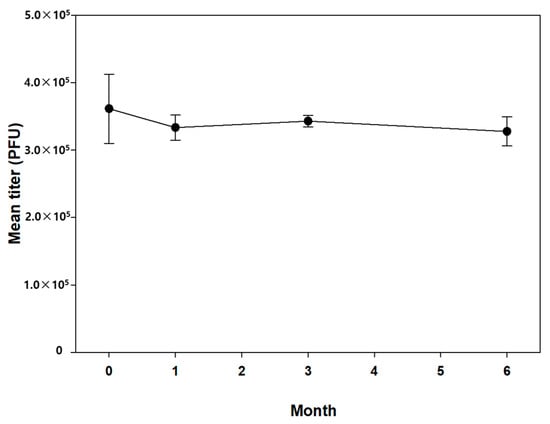 Since the stability of vaccine-coated microneedles was well maintained at −20 °C for a month, we further examined the change in virus titer for 6 months under the same storage conditions. For this study, the microneedles were coated with 3.3 × 105 PFU of the vaccinia virus, which is higher than the human dose (2.5 × 105 PFU), considering the typical delivery efficiency of microneedles (approximately 80%) [42,43]. PVA (5% w/v) and trehalose (15% w/v) were used as excipients, and the vaccine-coated microneedles were dried under vacuum to minimize virus titer reduction. As shown in Figure 5, the virus titer appeared to be slightly reduced during the first month of storage but there was no statistically significant difference. In addition, the virus titer was maintained over 6 months.