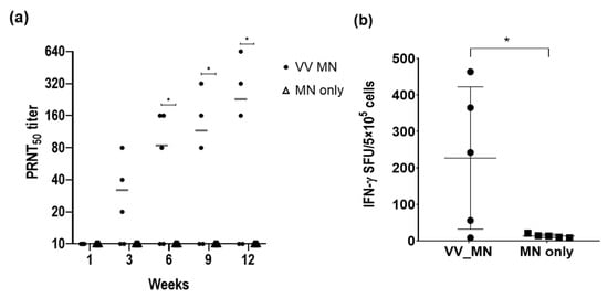 Humoral and cell-mediated immune responses after vaccination using microneedles. (a) PRNT50 titer of neutralizing antibody against the vaccinia virus, and (b) interferon (IFN)-γ-secreting cells were evaluated using the enzyme-linked immunospot (ELISPOT) assay for analyzing T-cell-mediated immune response. Horizontal bars in each graph indicate geometric mean titer. Statistical significance compared to MN only group was determined by a t-test (* p < 0.05). PRNT, plaque reduction neutralisation test; SFU, spot forming unit.