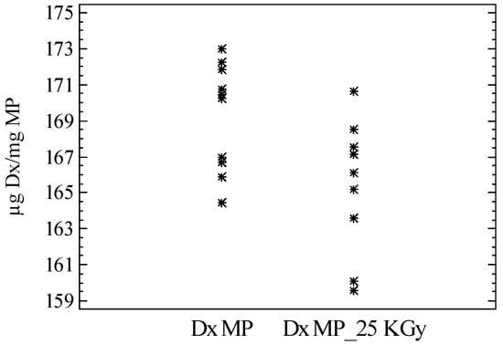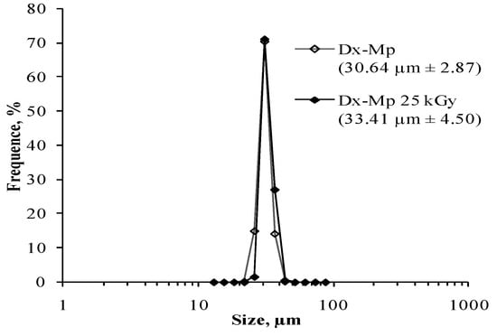 Dx-MS were subjected to 60Cobalt radiation at 25 kGy. Samples were placed into 2 mL glass vials before closing with rubber and an overseal closure. Vials were sterilized in dry ice to assure a low temperature (−78.5 °C) during the irradiation process [36].