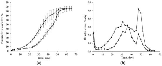 The release profile of Dx from the PLGA MS exhibited sensible changes after sterilization (Figure 5a,b). For example, the time necessary to release 50% of loaded dexamethasone was reduced to 12 days for gamma-irradiated samples as compared with non-sterilized particles. The similarity factor f2 was selected as a model-independent method to compare the two release profiles, obtaining an f2 value of 35.5, lower than the similarity limit (f2 = 50), confirming that the changes in the release profile were due to the sterilization process. These changes in the Dx release profile after gamma-irradiation were attributed to the induction of ester bond cleavage and the resulting decrease in the polymer molecular weight [26,37,38].