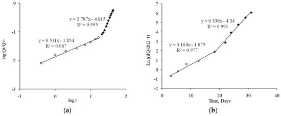 As can be observed in Figure 6a,c, experimental data fit the Korsmeyer–Peppas equation showing a biphasic behavior. Determination coefficient and “n” values are compiled in Table 4. In accordance with this model, the first phase of the release (0–17 days) was characterized by an anomalous transport (n = 0.51), indicating that not only drug diffusion, but also polymeric matrix changes controlled the release of dexamethasone [39]. In the second phase (17 days until the end), the strong alterations produced on the polymeric matrix structure might control the drug release (n > 0.85), according to a Super Case II transport.