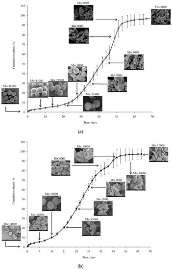 In order to complete and integrate the information obtained from the kinetic evaluation of the drug release profiles, both the polymer molecular weight (MW) and the morphological aspects of microspheres were monitored during the release study (Figure 7). Effectively, during the first 15–17 days, microspheres did not appreciably change their external morphology and, therefore, exhibited a spherical shape over this time period. At the same time, only a moderate reduction in PLGA MW (15%) was observed. This behavior should be in concordance with the anomalous transport proposed after Korsmeyer–Peppas fitting and with the low polymer erosion rate observed after Heller and Baker treatment. During weeks 3 and 4, microspheres maintained their spherical structure; however, their surfaces started to deteriorate more. This may be explained by the higher polymer erosion rate observed (Table 4), which was confirmed by the reduction in the polymer MW (45% of the initial value). No further MW reduction was observed until the end of the study. However, according to the SEM pictures, in the fifth week of the release, the inner microsphere structure appeared to be so weak that particles disintegrated, which may be the origin of the Super Case II transport observed according to Korsmeyer–Peppas fitting in the second phase of the study.