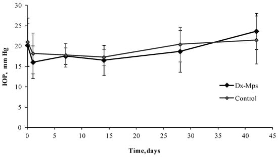 Intraocular pressure (IOP) mean values (± standard error of the mean (SEM)) obtained at different times of the study: before injection, and 1, 7, 14, 28, and 42 days after injection, for control and eyes that received a sub-Tenon injection of Dx-MS. No significant differences were found between groups (p > 0.05).