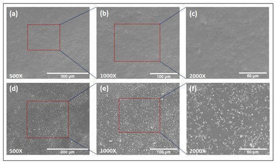 Scanning electron microscope (SEM) images of AXGL5 (blank) film (a–c) and AXGL5D (gentamicin (GM)-loaded) film (d–f) captured at 500×, 1000×, and 2000× magnifications.