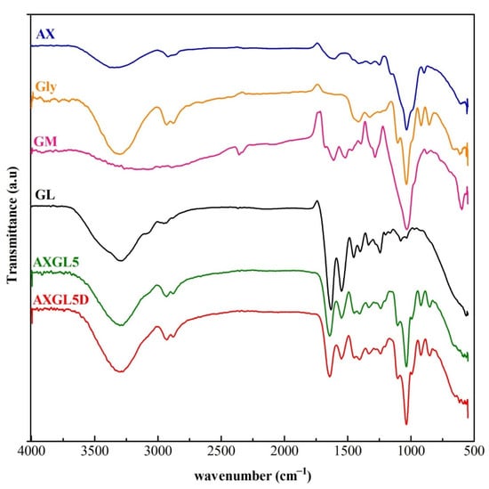 On the other hand, all characteristic peaks of pure AX, GL, and glycerol were observed in the FTIR spectra of films (AXGL5 and AXGL5D) without any major shift (shown in Table S2). However, the peaks of GM were not clearly observed in the FTIR spectra of AXGL5D, which might be attributed to the uniform blending of the film components, which masked the GM peaks (due to the lower concentration of GM in the films). The presence of the characteristic peaks of components of the film and the absence of any new peak in the spectra of AXGL5 and AXGL5D indicate that the film components were compatible with each other [].
