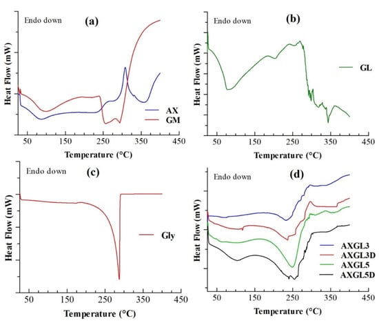 The results of DSC analyses of film components (AX, GL, glycerol, GM) and AX-GL films (with and without GM) are presented in Figure 3. DSC of AX (Figure 3a) showed a broad endothermic peak (65–115 °C) and an exothermic peak (~309 °C), which can be attributed to the loss of entrapped moisture and thermal decomposition of the polysaccharide backbone, respectively. These DSC peaks of AX are in close agreement with our previous report []. DSC of GM (Figure 3a) exhibited endotherms due to the loss of moisture (65–115 °C), melting of GM (~252 °C), and decomposition (~290 °C) of GM []. On the other hand, DSC of GL (Figure 3b) exhibited a broad merged endotherm (~60–150 °C), attributed to the glass transition, water loss, and denaturation of gelatin []. Moreover, the isomerization temperature and decomposition endotherms of GL were observed at approximately 200 °C and above 280 °C, respectively []. In the DSC curve of glycerol (Figure 3c), a sharp decomposition endotherm was observed at 287 °C [].